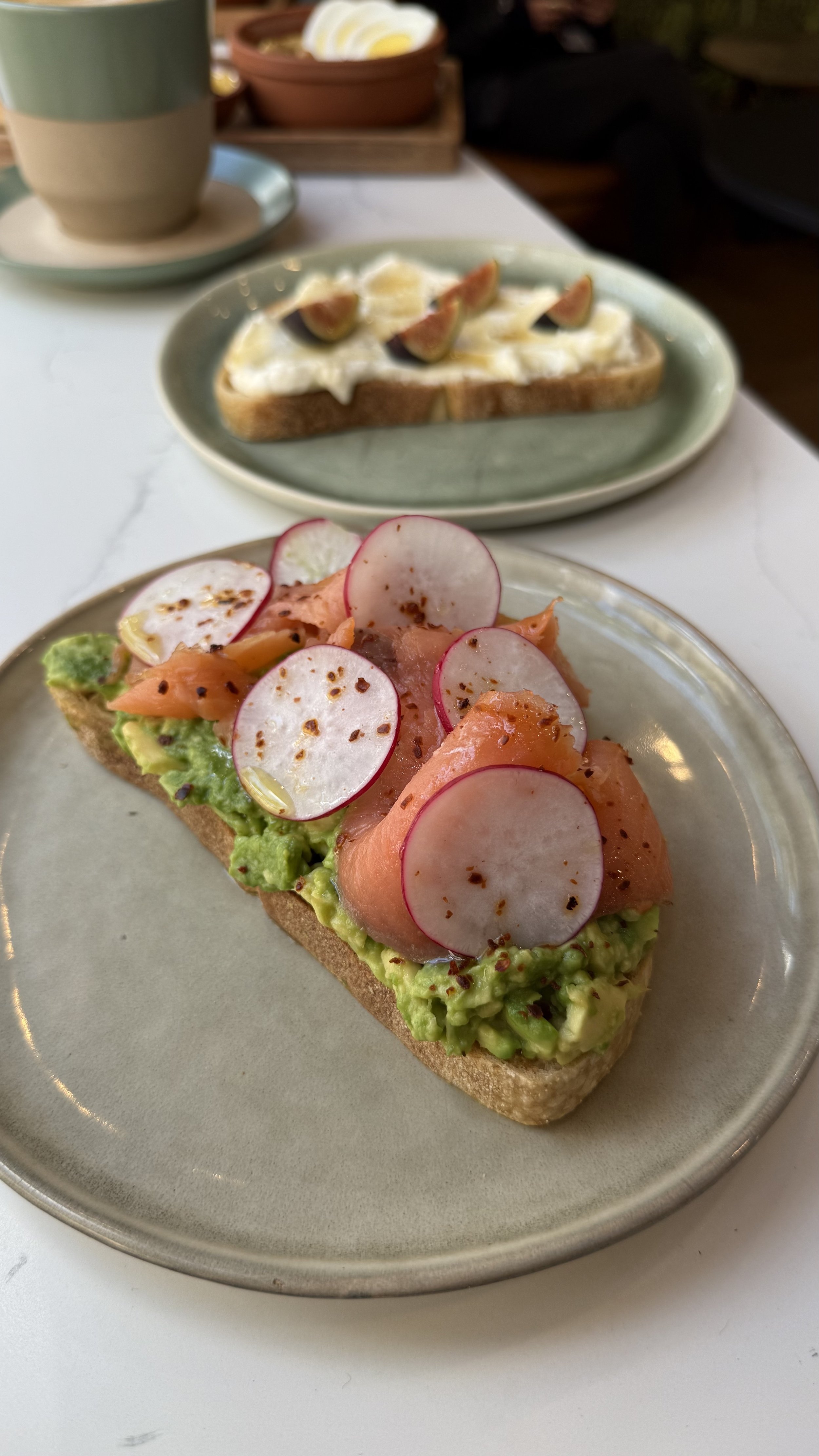 Organic avocado mashed on toasted sourdough with shaved radish, crumbled sheep feta, aleppo pepper and olive oil